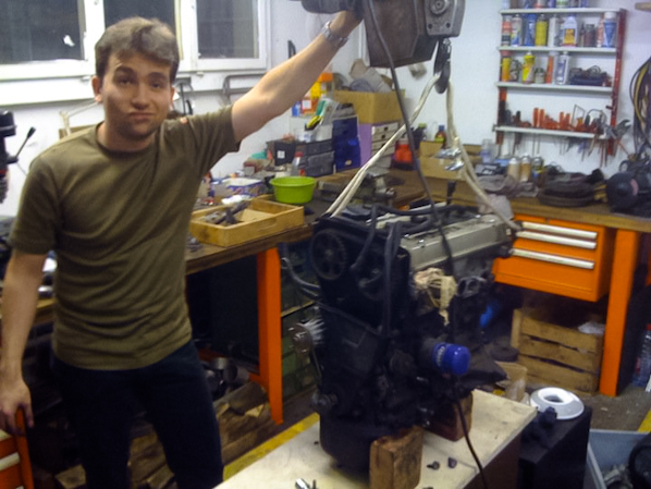 TEAMWORK! The Boss applying his special magic engine healing skills, me having a glass of white wine in the background. (actually that’s a piston.. 😉 )