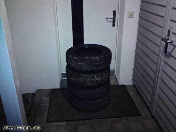 A stash of tires in front of a door.Let’s have a look at another one of our fearless drivers, this guy playing at and over the limit in a car that’s exactly as old as himself..