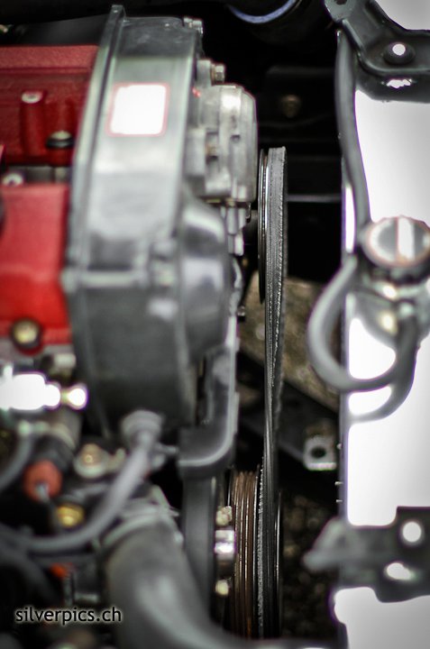 This is what we found after one morning of high rpm grip racing in the S13’s engine bay. It looks like the belt has flipped over somehow and half of it dispersed. Thanks to an attentive spectator in the paddock, who reported the issue while looking at our engine bays, nothing serious happened to the engine.